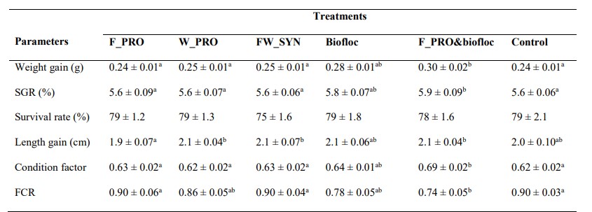 Trọng lượng cơ thể cuối cùng và mức tăng trọng của cá con cao hơn đáng kể (P ≤ 0,05) ở F_PRO&biofloc so với các nghiệm thức và đối chứng khác, với biofloc ở mức trung bình (Bảng 3). Tôm trong nhóm biofloc và F_PRO&biofloc ăn bioflocs lơ lửng trong nước, cung cấp thêm thức ăn và thúc đẩy tăng trưởng. Bioflocs cung cấp protein, lipid, khoáng chất và vitamin cần thiết cho sự phát triển của tôm. Tốc độ tăng trưởng (SGR) cao nhất ở nhóm F_PRO&biofloc, cao hơn đáng kể so với các nhóm khác (P ≤ 0,05). Tỷ lệ sống sót cao hơn 75% ở tất cả các nhóm, không có sự khác biệt đáng kể. FCR thay đổi từ 0,74 đến 0,90 (Bảng 3) và cao hơn đáng kể (p ≤ 0,05) ở nghiệm thức biofloc &F_PRO so với các nghiệm thức khác và CTRL; tuy nhiên, FCR không khác biệt đáng kể (p ≥ 0,05) giữa biofloc và biofloc &F_PRO. Xu hướng kết quả tương tự được lặp lại trong các nghiên cứu trước đây đối với tôm được sản xuất trong hệ thống biofloc (Ray và Lotz, 2014; Effendy và cộng sự, 2016).