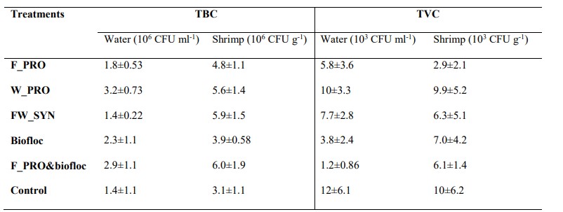 TBC trong nước cao hơn ở nhóm W_PRO (3,2±0,73 × 106 CFU/ ml) so với các nhóm khác, nhưng không có sự khác biệt đáng kể (Bảng 4). TBC trong tôm dao động từ 3,1±1,1 đến 6,0±1,9 × 106 CFU/ g và không có sự khác biệt đáng kể giữa các nhóm. TBC cao hơn ở nhóm F_PRO&biofloc so với đối chứng. Hệ thống biofloc và men vi sinh F_PRO có thể làm tăng lượng vi khuẩn có lợi trong ruột tôm Mật đường trong thức ăn cũng góp phần thúc đẩy sự phát triển của vi sinh vật có lợi. TVC trong mẫu nước và tôm được tìm thấy ở đối chứng cao hơn (p ≥ 0,05) so với các nghiệm thức sử dụng men vi sinh và mật đường (Bảng 4). Trong nghiên cứu này, việc áp dụng chế phẩm sinh học và mật đường trong các nghiệm thức có chứa Bacillus spp trong chế phẩm sinh học có thể là nguyên nhân khiến TVC trong nước và tôm thấp hơn so với đối chứng. Điều này phù hợp với Li và cộng sự (2009) và Villaseñor và cộng sự (2013) báo cáo rằng việc bổ sung hỗn hợp men vi sinh thương mại có chứa Bacillus có thể thay đổi quần thể vi khuẩn đường ruột ở tôm bao gồm việc giảm số lượng Vibrio. Trong nhiều trường hợp, Vibrio spp. là những vi khuẩn cơ hội, chỉ gây bệnh và làm chết động vật trong tình trạng căng thẳng về mặt sinh lý (Alderman và Hastings 1998).