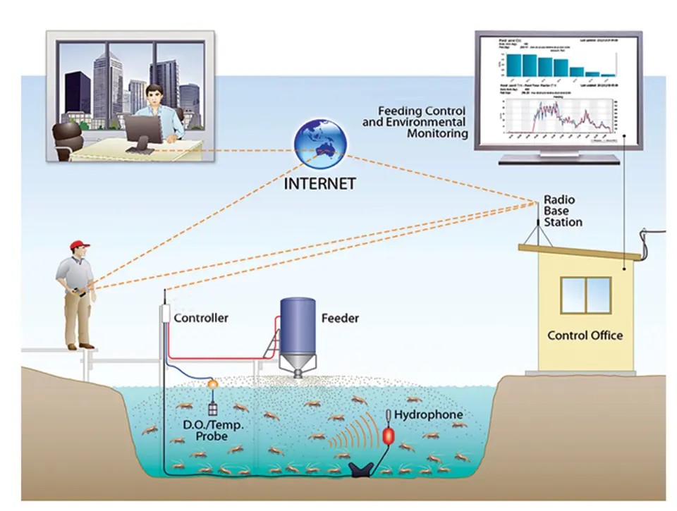 Hệ thống cho ăn bằng âm thanh cho phép điều khiển dựa trên cảm biến của nhiều thiết bị cho ăn trong ao.