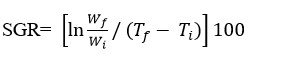 trong đó SGR là tốc độ tăng trưởng cụ thể (Zhou, Yang và cộng sự 2006), Wi lần lượt là ban đầu và Wf là trọng lượng tươi cuối cùng của một giai đoạn. Tf và Ti là khoảng thời gian giữa ngày bắt đầu và ngày kết thúc.