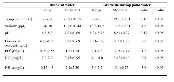 Trong bảng 1, nhiệt độ nước thay đổi từ 26°C đến 30°C trong thời gian nghiên cứu. Độ mặn dao động rộng được quan sát thấy trong hệ thống ao nuôi tôm nước lợ và cả trong hệ thống nước lợ lần lượt là 14ppt đến 30ppt. Độ pH dao động ở cả nước lợ (7,01 ± 0,69) và nước ao nuôi tôm nước lợ (8,54 ± 0,27) và không có sự khác biệt đáng kể trong suốt thí nghiệm (p > 0,05). Hàm lượng oxy hòa tan trong nước lợ có giá trị tương đối ổn định (4,58-5,95) so với nước ao nuôi tôm dao động từ 2,31-5,36. Tuy nhiên, không có sự khác biệt đáng kể giữa cả hai hệ thống (p>0,05). Trong khi đó tất cả các chất dinh dưỡng vô cơ hòa tan trong cả hai mẫu rất đều khác nhau (p<0,05), điều này cho thấy nước ao nuôi tôm giàu chất dinh dưỡng hơn so với nước lợ không nuôi tôm.