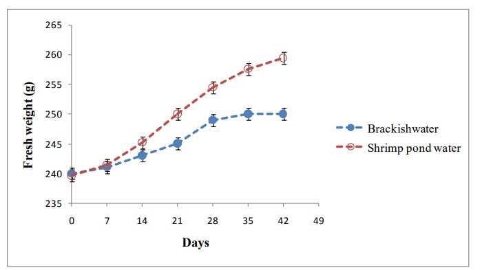 Sinh khối và tốc độ tăng trưởng riêng (SGR) của G. edulis tăng dần trong suốt quá trình nghiên cứu (Hình 1). Giá trị sinh khối cao nhất là 260g trong nước ao nuôi tôm nước lợ so với chỉ 250g trong nước lợ và SGR lần lượt đạt được là 1,25% và 0,59% khi kết thúc thí nghiệm. So sánh SGR của cả hai hệ thống cho thấy ý nghĩa rất lớn (p < 0,01). Trong khi đó, sinh khối trung bình trong nước ao nuôi tôm (249 ± 0,63g) cao hơn một chút so với hệ thống nước lợ (246 ± 0,85g).