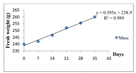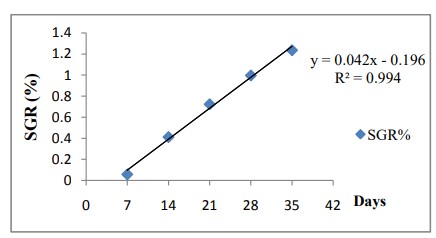 Hình 2 và 3 cho thấy mối tương quan giữa sự phát triển của tảo biển về trọng lượng tươi và SGR. Trọng lượng tươi tăng dần theo thời gian và cho giá trị R2 đáng chú ý là 0,989. Trong khi đó, SGR cũng tỷ lệ thuận với mức tăng trọng lượng tươi.