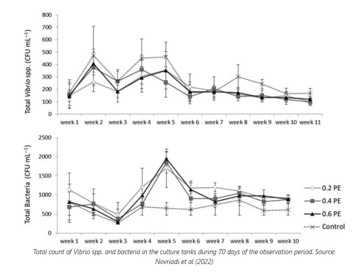 Theo nghiên cứu, kết quả chứng minh rằng việc áp dụng liên tục probiotic và enzyme đa chủng loại có thể làm giảm tổng số lượng Vibrio spp. trong môi trường nuôi.