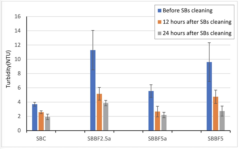 Hình 2: Sự thay đổi về độ đục trung bình (NTU) trong các hệ thống không thay nước đối với tôm thẻ chân trắng L. vannamei trước và sau khi làm sạch SB (12 giờ và 24 giờ) trong quá trình nghiên cứu. Các thanh lỗi biểu thị SD.