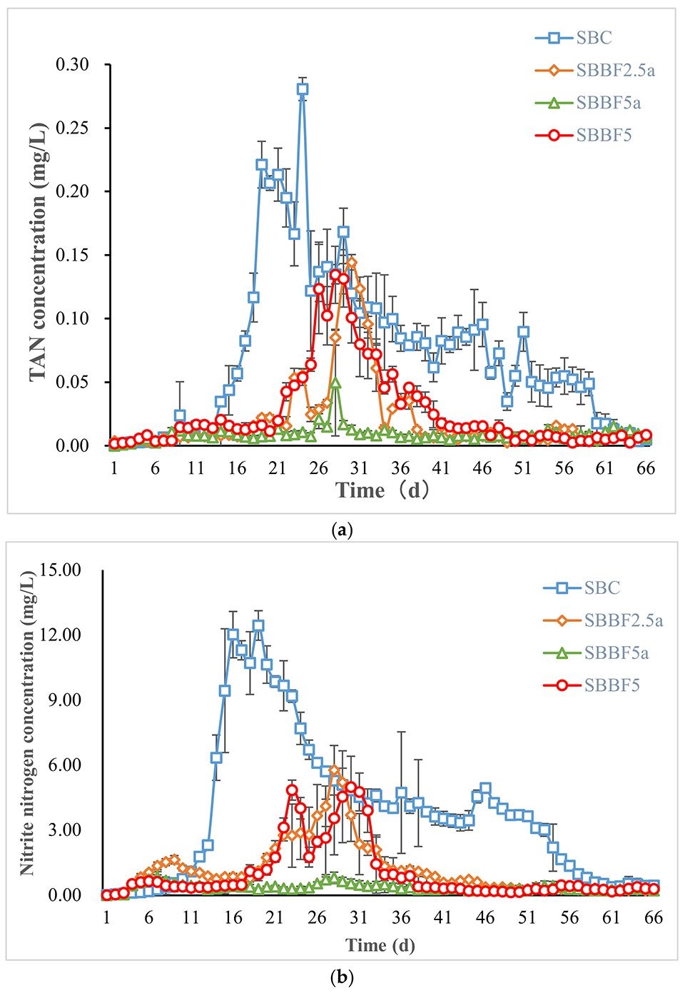 Tổng nồng độ nitơ amoniac (TAN) của cả 4 nghiệm thức luôn thấp hơn 0,3 mg/L và duy trì dưới mức an toàn đối với L. vannamei trong suốt thí nghiệm. Mặc dù nghiệm thức SBC có nồng độ trung bình và nồng độ đỉnh của TAN cao hơn so với nghiệm thức SBBF, nhưng chúng thấp hơn nhiều so với nồng độ được báo cáo trong hệ thống nuôi với chất nền nhân tạo và hệ thống nuôi biofloc.