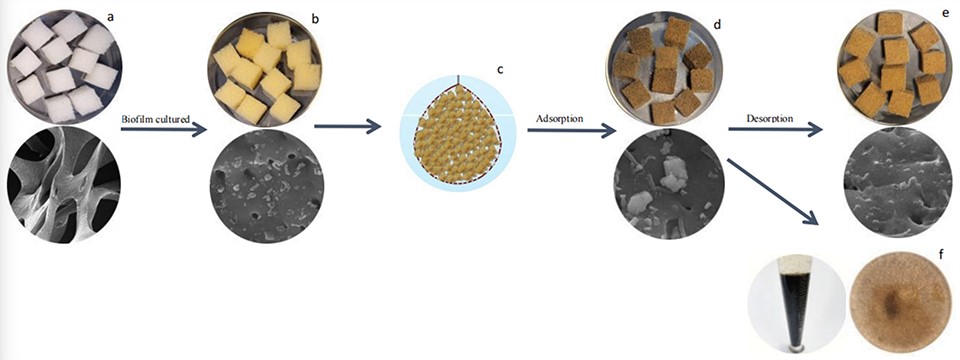 Hình 4: Sơ đồ hệ thống không thay nước đối với tôm thẻ chân trắng L. vannamei bằng cách sử dụng chức năng nitrat hóa và các đặc tính hấp phụ/giải hấp của giá thể vi sinh dạng xốp (SB). (a) SB không tạo màng sinh học; (b) SB đã tạo màng sinh học 25 ngày; (c) SBBF đựng trong túi lưới terylene; (d) SBBF được sử dụng trong bể chứa; (e) SBBF với khả năng tái tạo khả năng hấp phụ sau khi làm sạch; (f) Chất hấp phụ được loại bỏ khỏi SBBF.