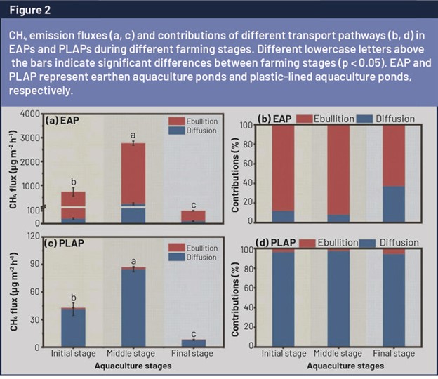 Dòng CH4 trung bình trong EAP lớn hơn đáng kể so với PLAP. Cả hai loại ao nuôi trồng thủy sản đều cho thấy các mô hình thời gian tương tự, với dòng phát thải CH4 cao hơn nhiều ở giai đoạn nuôi giữa (Hình 2a). Trong EAP, dòng CH4 là 144,2–2547,6 µg/ m2/h chiếm 87,9–92,0% tổng lượng phát thải CH4 (Hình 2b). Ngược lại, khuếch tán là con đường vận chuyển chủ yếu trong PLAP, chiếm 94,3–97,4% lượng phát thải CH4 (Hình 2d).