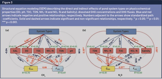 Về các tác nhân môi trường của nồng độ và lưu lượng GHG, giữa hai loại ao nuôi trồng thủy sản, sự thay đổi trong CCH4 (hoặc CN2O) và FCH4 (hoặc FN2O) tương quan tích cực với nhiệt độ không khí (TA), nhiệt độ nước (TW), TOC và chất nền chứa nitơ (ví dụ: tổng nitơ hòa tan [TDN], NH4+-N) (p < 0,01), nhưng tương quan tiêu cực với DO và độ mặn (SAL) (p < 0,05). Theo phân tích SEM, tính khả dụng của chất nền có tác động tích cực trực tiếp đến nồng độ GHG hòa tan, sau đó tác động đến lượng khí thải GHG (Hình 3). Ngược lại, DO và độ mặn tác động tiêu cực đến FCH4 và FN2O (Hình 3).