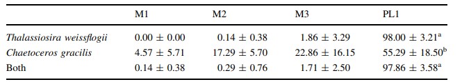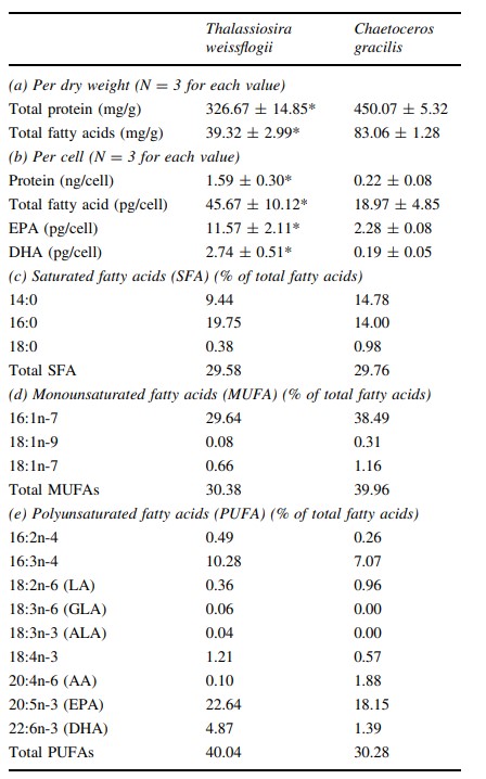 C. gracilis có hàm lượng protein (1,49) và tổng axit béo (2,19) trên trọng lượng khô cao hơn đáng kể so với T. weissflogii (Bảng 1a). Tuy nhiên, khi các giá trị được biểu thị theo từng tế bào, T. weissflogii chứa protein (8,09) và tổng lượng axit béo (2,59) cao hơn đáng kể so với C. gracilis (Bảng 1b). Mức độ trên mỗi tế bào của cả EPA và DHA đều cao nhất ở T. weissflogii, mức EPA và DHA trên mỗi tế bào ở T. weissflogii lần lượt cao hơn tới 69 và 159 so với C. gracilis.
