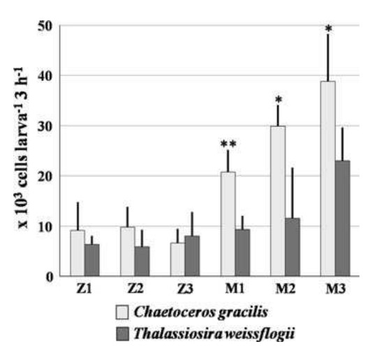 Hình 2 Số lượng tế bào tảo cát được một ấu trùng Penaeus monodon ở các giai đoạn phát triển khác nhau tiêu thụ trong 3 giờ. Giai đoạn Z Zoea, giai đoạn M mysis. N = 5 cho mỗi biểu đồ. * P<0,05 và ** P<0,01, so với các giá trị tương ứng của Thalassiosira weissflogii