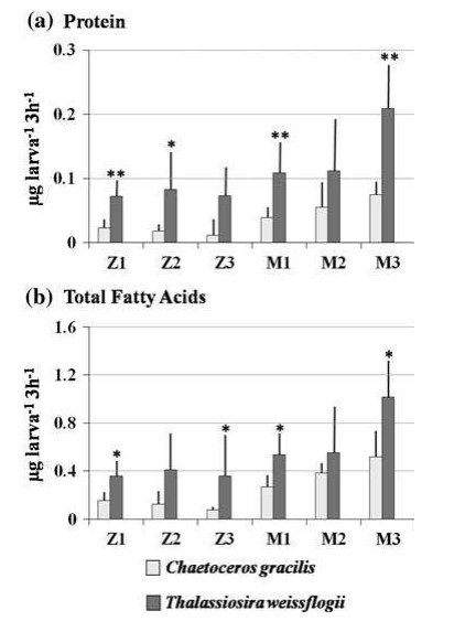 Hình 3 Protein (a) và tổng axit béo (b) được một ấu trùng Penaeus monodon ở các giai đoạn phát triển khác nhau tiêu thụ trong 3 giờ, khi cung cấp hỗn hợp Chaetoceros gracilis và Thalassiosira weissflogii. Giai đoạn Z Zoea, giai đoạn M mysis. N = 5 cho mỗi biểu đồ. * P<0,05 và ** P<0,01, so với các giá trị tương ứng của C. gracilis