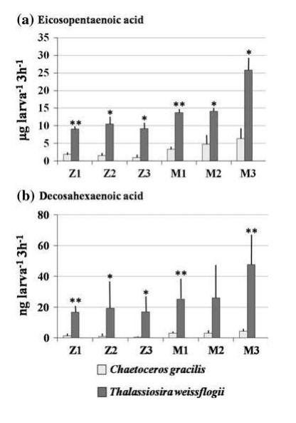 Hình 4 Axit Eicosapentaenoic (a) và axit desahexaenoic (b) được một ấu trùng Penaeus monodon ở các giai đoạn phát triển khác nhau tiêu thụ trong 3 giờ, khi cung cấp hỗn hợp Chaetoceros gracilis và Thalassiosira weissflogii. Giai đoạn Z Zoea, giai đoạn M mysis. N = 5 cho mỗi biểu đồ. * P<0,05 và ** P<0,01, so với các giá trị tương ứng của C. gracilis