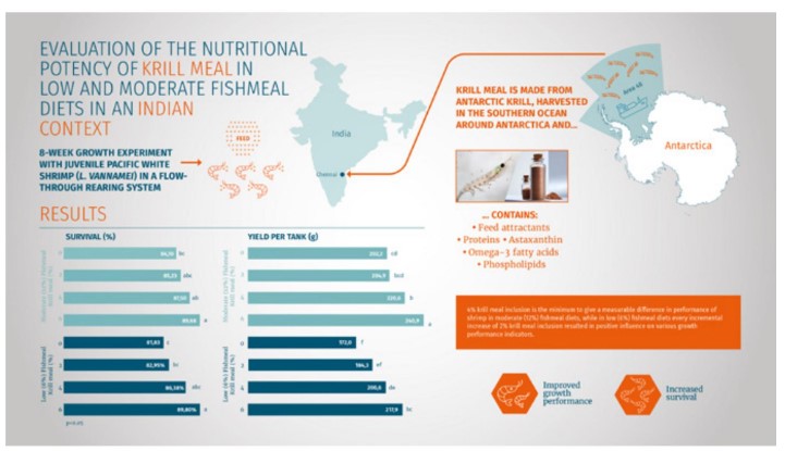 Ấn Độ là nước xuất khẩu tôm lớn sang thị trường Mỹ, châu Âu và châu Á. Tuy nhiên, vị trí của nó trong ngành tôm toàn cầu sẽ phụ thuộc vào khả năng duy trì tính cạnh tranh, bền vững và đáp ứng các mục tiêu năng suất cao hơn nhờ tôm khỏe hơn và kích cỡ lớn hơn. Thức ăn đóng vai trò chính trong việc giúp các nhà sản xuất tôm đạt được những mục tiêu này, và đó là lý do tại sao việc phát hiện ra các thành phần chức năng, như bột krill, có thể giúp người nuôi đạt được kết quả tối ưu.