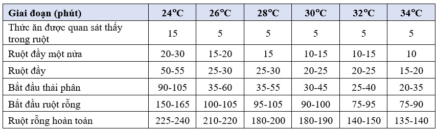 Đối với hầu hết các nghiệm thức, sau khi tôm ăn, chỉ mất khoảng 5 phút để quan sát thức ăn trong ruột trống, nhưng sự khác biệt đáng kể về tốc độ tiêu hóa bắt đầu xuất hiện sau đó. Ví dụ, phải mất tới 55 phút ở nhiệt độ 24°C để ruột tôm đầy thức ăn so với 20 phút ở nhiệt độ 34°C. Khi phân bắt đầu được thải ra, sự khác biệt thậm chí còn tăng lên đáng kể, thời gian này tăng lên 105 phút ở 24°C so với 35 phút ở 34°C. Kết quả từ tất cả các thử nghiệm được so sánh và tổng hợp trong Bảng 1.
