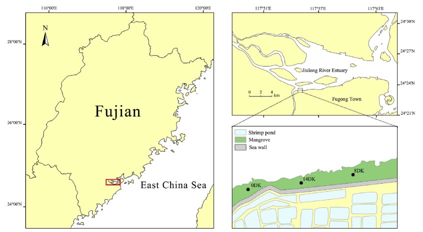 Các địa điểm nghiên cứu nằm trong rừng K. obovata ở bờ nam của cửa sông Cửu Long (Hình 1) gần làng Caoputou (24°24′N, 117°55′E), tỉnh Phúc Kiến của Trung Quốc. Nhiệt độ và lượng mưa trung bình hàng năm lần lượt là 21,0°C và 1371 mm (Wang và cộng sự, 2016). Thủy triều thường diễn ra vào ban ngày, với phạm vi thủy triều trung bình khoảng 4 m. Kết cấu của đất ngập mặn chủ yếu là phù sa và đất sét, với độ mặn của nước thủy triều bên cạnh các khu rừng dao động từ 12–26 (Alongi và cộng sự, 2005). Từ đê biển vào đất liền là ao tôm dày đặc và phía ngoài khơi là rừng ngập mặn. Các khu rừng trưởng thành của K. obovata có cùng tuổi đứng là 55 năm, rộng khoảng 40m từ đất liền ra biển (Chen và cộng sự, 2018), nằm trong vùng triều cao và được ngăn cách với ao nuôi tôm bằng đê biển đá. Các ao nuôi tôm xung quanh rừng K. obovata chủ yếu nuôi tôm thẻ Litopenaeus vannamei. Trong thời gian canh tác, các loại thức ăn khác nhau được đưa vào ao ở các giai đoạn khác nhau, với việc bổ sung TN tích lũy 38,18 g/ m2, bổ sung TP 7,47 g/ m2 và axit amin phycocyanin khoảng 45,00 g/ m2.