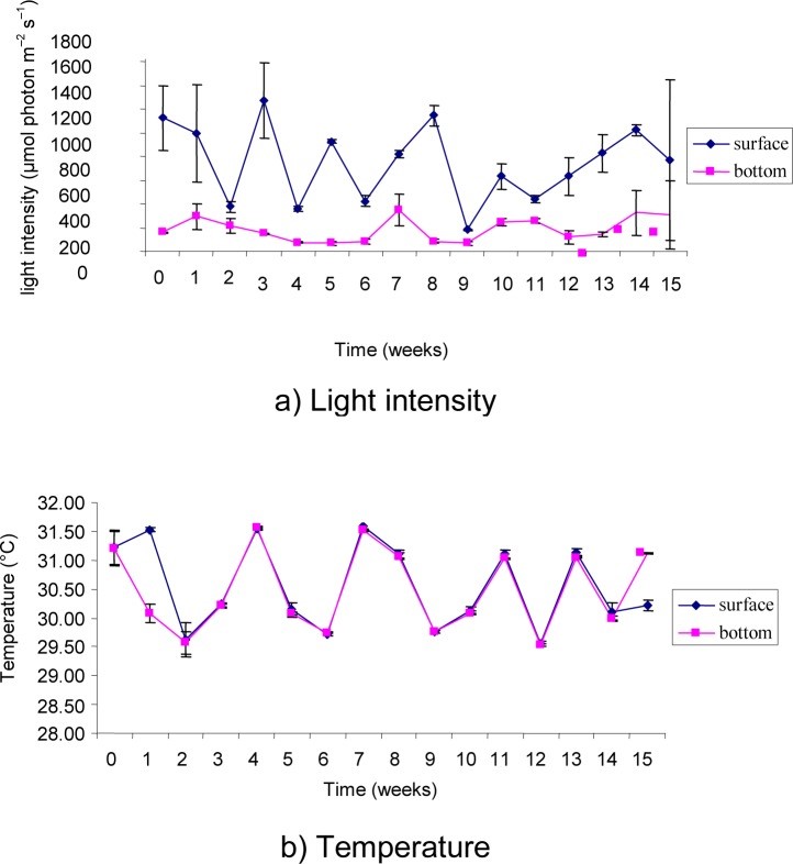 Hình 1. Cường độ ánh sáng trung bình hàng tuần, pH, DO, nhiệt độ và độ mặn được đo ở bề mặt và đáy ao nuôi tôm trong 15 tuần nuôi tôm. Thanh lỗi biểu thị độ lệch chuẩn
