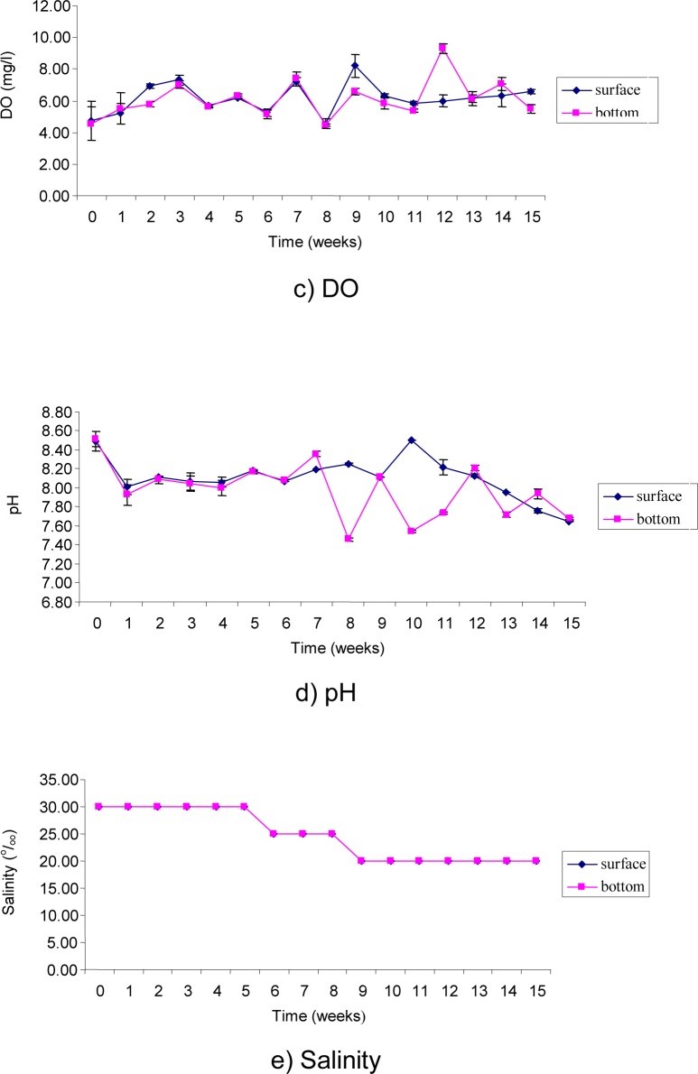 Độ mặn của nước dao động từ 20 ± 0,0‰ đến 30 ± 0,0‰ trong các giai đoạn canh tác [Hình 1(e)]. Độ mặn 30‰ được duy trì trong thời gian đầu nuôi từ đầu (tuần 0) đến tuần thứ 5, nhưng bắt đầu giảm xuống 25‰ từ tuần thứ 6 đến tuần thứ 8 và tiếp tục giảm xuống 20‰ trong tuần thứ 9 cho đến cuối vụ nuôi.