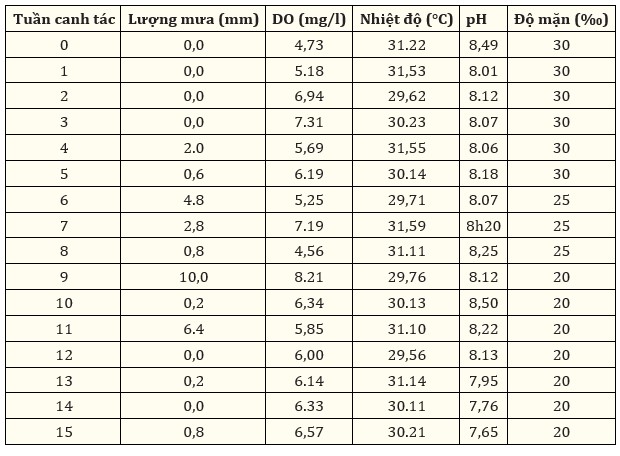 Bảng 1 hiển thị dữ liệu lượng mưa hàng tuần cho khu vực Balik Pulau và nồng độ trung bình của DO, nhiệt độ, pH và độ mặn của ao nuôi tôm trong suốt 15 tuần của thời kỳ nuôi tôm. Hình 1 cho thấy giá trị trung bình hàng tuần của các thông số vật lý được đo trên bề mặt và dưới đáy ao nuôi tôm trong suốt 15 tuần nuôi tôm.