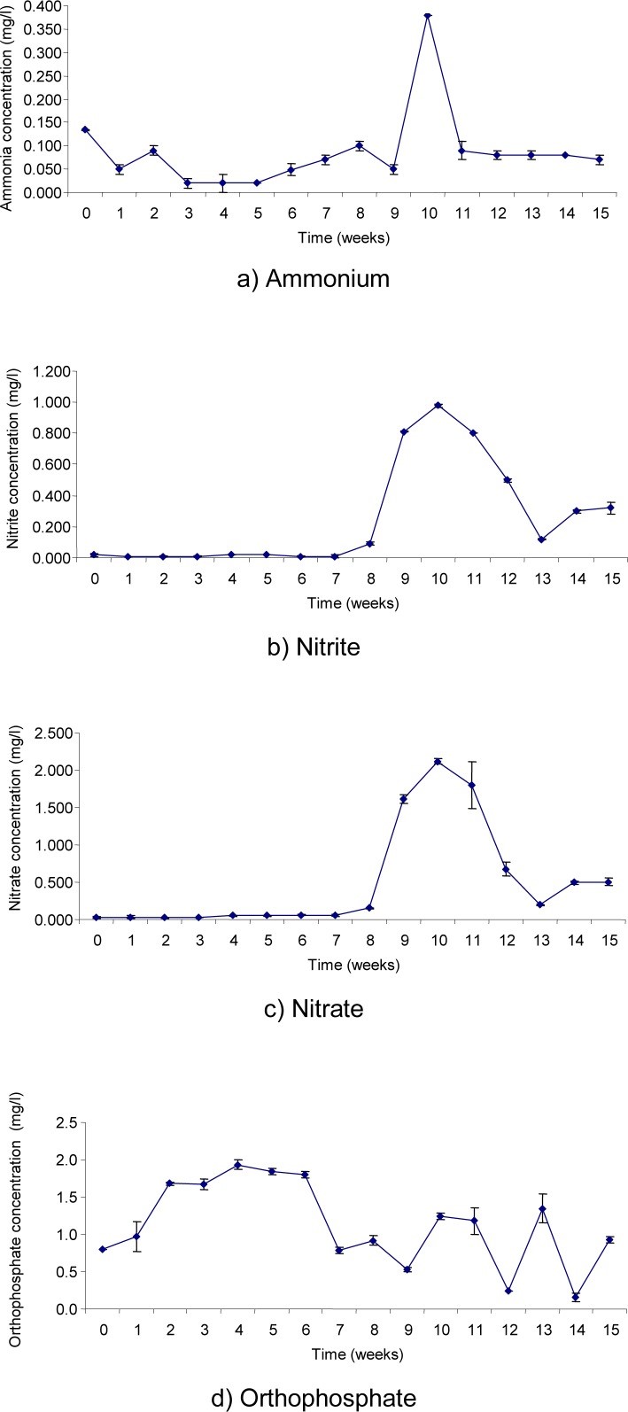 Trong thời gian nuôi, nồng độ amoni trung bình dao động từ 0,017 đến 0,38 mg/l [Hình 2 (a)]. Nồng độ amoni nhìn chung không dao động nhiều từ tuần 1 đến tuần 9. Tuy nhiên, nồng độ amoni tăng mạnh được quan sát thấy vào tuần 10, sau đó là sự suy giảm trong các tuần tiếp theo (tuần 11–15). Nồng độ nitrit và nitrat trung bình nằm trong khoảng từ 0,01 ± 0,004 đến 0,98 ± 0,01 mg/l và 0,024 ± 0,01 đến 2,12 ± 0,035 mg/l [Hình 2(b) và 2(c)]. Nồng độ nitrat và nitrit cao nhất (lần lượt là 0,98 mg/l và 2,12 mg/l) được ghi nhận vào tuần thứ 10, sau đó giảm đột ngột trong các tuần tiếp theo. Nhìn chung, nồng độ nitrit và nitrat dưới 0,2 mg/l từ giai đoạn đầu nuôi cho đến tuần thứ 8 trước khi nồng độ này tăng lên sau tuần thứ 8 cho đến tuần thứ 10. Nồng độ nitrit và nitrat sau đó giảm từ tuần 10 đến tuần 13 và nồng độ nitrit và nitrat đã giảm trở lại tăng nhẹ ở tuần 14 và 15.