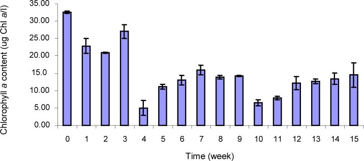 Nồng độ Chlorophyll a trong nghiên cứu này nằm trong khoảng từ 5,03 ± 2,17 đến 32,61 ± 0,35 μg/l (Hình 3). Nồng độ chlorophyll a cao nhất là vào đầu giai đoạn nuôi tôm nhưng nồng độ giảm xuống giá trị thấp nhất vào tuần thứ 4. Nồng độ chlorophyll a sau đó tăng nhẹ từ tuần 5 đến tuần 7 và giảm trở lại từ tuần 8 đến tuần 10. Tuy nhiên, nồng độ chlorophyll a tiếp tục tăng từ tuần 11 đến các tuần tiếp theo cho đến khi kết thúc giai đoạn nuôi cấy.