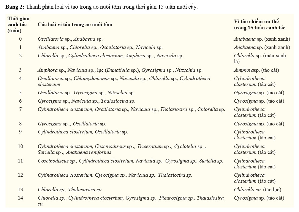 Bảng 2 cho thấy thành phần loài vi tảo trong ao nuôi tôm trong suốt 15 tuần nuôi tôm. Tổng cộng có 19 loài vi tảo đã được xác định, với Bacillariophyta hoặc tảo cát đóng góp tới 72% thành phần loài, tiếp theo là Chlorophyta (11%) và Cyanophyta hoặc vi tảo lam (11%).