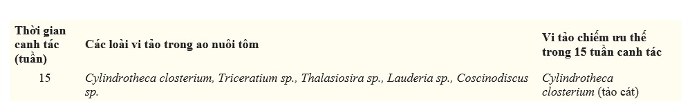 Bảng 2: Thành phần loài vi tảo trong ao nuôi tôm trong thời gian 15 tuần nuôi cấy.