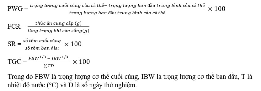 Đối với tất cả các thử nghiệm cho ăn, các thông số về pH, oxy hòa tan (DO), nhiệt độ nước và độ mặn được đo 4 lần mỗi ngày bằng thiết bị Sonde đa thông số Aqua TROLL 500 và được kết nối với các ứng dụng AquaEasy (Bosch, Singapore) cho hệ thống theo dõi và ghi dữ liệu. Tổng amoniac-nitơ (TAN), nitrat và nitrit được đo hàng tuần bằng phương pháp quang phổ hấp thụ (DR890, HACH, USA). Vào cuối các giai đoạn cho ăn, tôm trong nghiên cứu ao thương mại được cân theo nhóm và đối với nghiên cứu đối chứng, tôm được phân nhóm và cân riêng để tính sinh khối cuối cùng, trọng lượng cuối cùng, tỷ lệ tăng trọng (PWG), tỷ lệ chuyển đổi thức ăn (FCR), tỷ lệ sống (SR), và hệ số tăng trưởng đơn vị nhiệt (TGC) như sau: