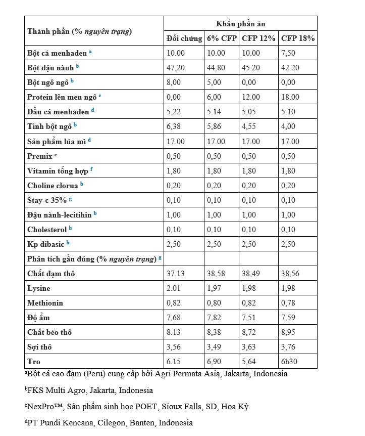 Bảng 1. Thành phần (% nguyên trạng) của khẩu phần ăn có chứa protein lên men từ ngô (CFP) vào khẩu phần ăn cơ sở và cho L. vannamei ăn trong 60 ngày trong điều kiện môi trường được kiểm soát.