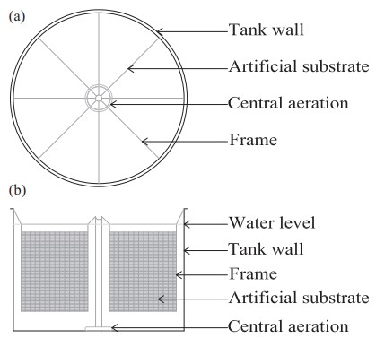 Lượng nền nhân tạo được sử dụng tương đương 100% diện tích bề mặt bể là 3,5 m2 (1,0 m2 đáy bể + 2,5 m2 diện tích mặt tường). Chất nền nhân tạo bao gồm màn chắn polyetylen có mắt lưới 1 mm (màn chống muỗi). Cả hai mặt của màn đều được xem xét khi tính toán diện tích nền và 8 chất nền được đặt trong mỗi bể (rộng 0,43 m × cao 0,51 m) (Hình 1a). Khoảng trống (lỗ) trên màn chống muỗi chiếm 41,1% diện tích bề mặt và được xem xét trong tính toán diện tích bề mặt. Các chất nền được khâu vào một khung cứng có đường kính 3 mm, dùng để kéo căng các tấm chắn và gắn chúng vào mép bể (Hình 1b). Khung này chiếm 0,01 m2 diện tích nền. Giá thể được cố định thẳng đứng trong cột nước cách bề mặt 5 cm và cao hơn đáy bể 13 cm. Tám chất nền được phân bố đồng đều trong mỗi bể. Các mảnh màn chống muỗi (1,5 cm × 8,0 cm = 12,0 cm2) được khâu vào các chất nền, dùng làm dụng cụ lấy mẫu để xác định hoạt động sinh học, chlorophyll-a và chất khô trên chất nền. Những dụng cụ lấy mẫu này được khâu vào nửa trên của chất nền (cách mặt nước 25,0 cm). Các dụng cụ lấy mẫu bổ sung cũng được đặt ở độ sâu 7,5 cm và 45,0 cm dưới mặt nước. Khi tính toán chlorophyll-a và chất khô của periphyton trên một đơn vị diện tích của chất nền, cả hai mặt của cùng một mảnh mẫu được xem xét (12,0 cm2 × 2 mặt = 24,0 cm2).