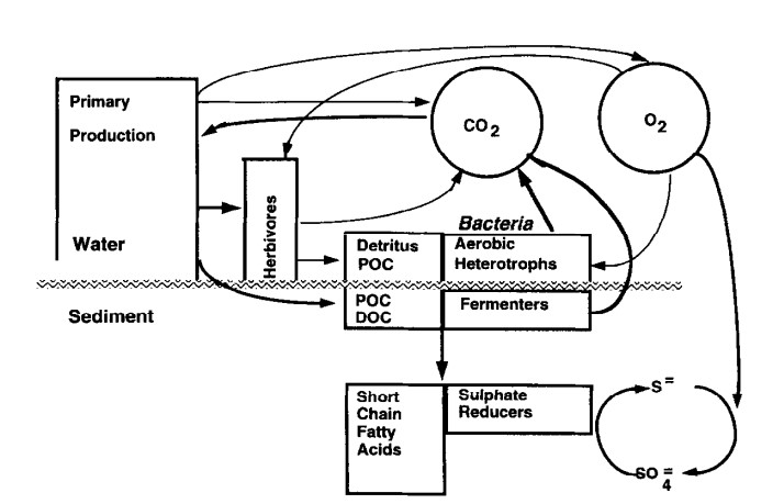 Nhiều chất hữu cơ bị phân hủy bởi vi khuẩn dị dưỡng hiếu khí trong cột nước và bề mặt trầm tích. Chất hữu cơ còn lại bị phân hủy ở vùng anoxic của trầm tích chủ yếu do vi khuẩn lên men. Năng suất của cả hai nhóm vi khuẩn chính này có thể dễ dàng xác định bằng phương pháp thymidine. Các axit béo chuỗi ngắn là sản phẩm cuối cùng của quá trình lên men được hô hấp thành CO2 bởi vi khuẩn khử sunfat. Hầu hết các chất hữu cơ đi vào trầm tích cuối cùng sẽ được các vi khuẩn này chuyển hóa thành carbon dioxide nếu nó không bị oxy hóa trong các quá trình trước đó. Hydro sunfua là sản phẩm chính khác của quá trình này.