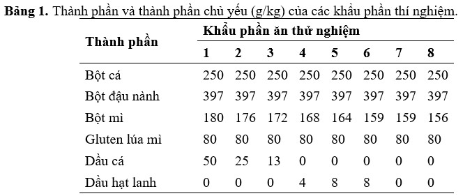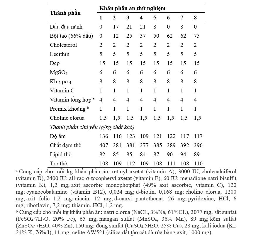 Tảo lên men Schizochytrium sp., đã được sử dụng trong nghiên cứu này (Nguồn: Alltech Lexington, KY, USA). Tảo lên men được ly tâm liên tục (5.000 g) để thu được chất rắn sau đó được phun sấy khô thu được bột tảo mịn. Máy sấy phun Kochiwa [sử dụng nguyên tử hóa li tâm (4.500 g) ở nhiệt độ đầu vào (140–150°C), buồng trung tâm (130–135°C) và nhiệt độ đầu ra là (80–85°C)] đã được sử dụng để chuẩn bị bột khô phun. Mất 6–8 giây để tạo thành bột tảo sau khi bơm. Thành phần quan trọng được đo theo phương pháp tiêu chuẩn của Hiệp hội các nhà hóa học phân tích chính thức, cho thấy bữa ăn này chứa hàm lượng lipid là 66%. Thành phần quan trọng của các thành phần như SBM, bột mì và gluten lúa mì cũng được đo lường tương tự. Tổng cộng có 8 khẩu phần ăn giàu nitơ (chứa 40% protein) và giàu năng lượng (9,0% lipid) được xây dựng để chứa lượng bột tảo ngày càng tăng (chứa 660 g/kg lipid có thể chiết xuất được; Bảng 1). Bất kể khẩu phần ăn nào, bột cá (FM) và bột đậu nành (SBM) là nguồn protein chiếm ưu thế và được bổ sung vào tất cả các khẩu phần ăn thử nghiệm ở mức tương ứng là 250 và 397 g/kg. Hàm lượng protein thô, lipid, vitamin và khoáng chất được điều chế đáp ứng nhu cầu của tôm He. Ngoài ra, cholesterol, choline clorua và lecithin được đưa vào tất cả các khẩu phần ăn để đáp ứng yêu cầu của L. vannamei. Khẩu phần đối chứng (khẩu phần 1) có 6% FO là nguồn lipid chính, tương tự như lượng sử dụng trong khẩu phần thương mại (Bảng 1). Khẩu phần 2 và 3 có lượng bột tảo và SBO ngày càng tăng, thay vào đó là FO. FO được thay thế hoàn toàn trong khẩu phần 4 bằng sự kết hợp của bột tảo, SBO và LSO. Khẩu phần ăn 5–8 cũng không chứa FO, nhưng có các kết hợp lipid khác nhau: khẩu phần ăn 5 có lượng LSO và SBO bằng nhau ở mức 8 g/kg; khẩu phần ăn 6 và 7 chứa lượng bột tảo bằng nhau, nhưng bổ sung thêm LSO hoặc SBO ở mức tương ứng là 8 g/kg; khẩu phần 8 chỉ chứa bột tảo là nguồn lipid bổ sung duy nhất, với hàm lượng cao nhất là 75 g/kg. Bột mì được điều chỉnh trong các khẩu phần thí nghiệm để bù đắp cho một lượng nhỏ protein thô trong bột tảo (Bảng 1). Trong khi đó, khẩu phần ăn Schizochytrium có ít EPA, nhưng có thể được tổng hợp bởi một số động vật thủy sinh từ tiền chất, ALA. Do đó, LSO, có hàm lượng ALA cao, đã được bổ sung vào khẩu phần ăn 4–6 để xác định xem liệu điều này có thể dẫn đến mức EPA cao trong tôm hay không. Nguyên liệu thức ăn khô được nghiền kỹ và trộn trong máy trộn (Hobart A200, Hobart, Troy, OH, USA) để chuẩn bị thức ăn cho tôm. Tiếp theo là thêm nước ấm để duy trì độ ẩm 35% và trộn thêm 10 phút nữa. Bột này của mỗi khẩu phần ăn được đưa qua máy tạo viên thức ăn chăn nuôi (máy xay thịt, Glen Mills Inc., Clifton, NJ, USA) với khuôn 2 mm, sau đó được sấy khô trong không khí trong 24 giờ. Các sợi dài của khẩu phần ăn được nghiền thành bột bằng máy xay (Glen Mills Inc., Clifton, NJ, USA) và thu được kích thước viên 2 mm bằng cách sử dụng rây. Sau khi sàng lọc, lượng thích hợp của LSO, SBO, và FO được thêm thủ công để ức chế sự phá hủy của các axit béo không bão hòa cao trong quá trình tạo hạt. Sau khi các khẩu phần được làm khô, thành phần hóa học bao gồm axit béo của các khẩu phần được xác định (Bảng 1).
