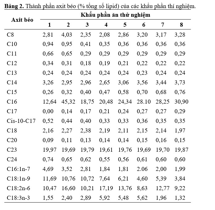 Bảng 2. Thành phần axit béo (% tổng số lipid) của các khẩu phần thí nghiệm.