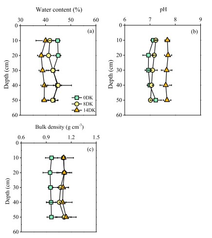 Hình 2. Hàm lượng nước trong đất, độ pH và mật độ khối lượng lớn trong các phần độ sâu đất khác nhau từ ba vị trí lấy mẫu. Các phương tiện và độ lệch chuẩn được hiển thị. (0DK: Rừng Kandelia obovata không tiếp nhận xả ao nuôi tôm, 8DK: Rừng Kandelia obovata tiếp nhận xả ao nuôi tôm 8 năm và 14DK: Rừng Kandelia obovata tiếp nhận xả nuôi tôm 14 năm.)