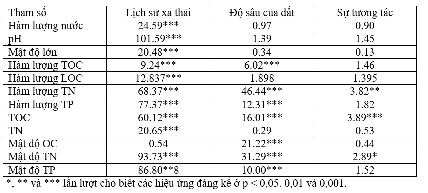 Bảng 1 Giá trị F của ANOVA hai chiều cho thấy ảnh hưởng của lịch sử xả thải ao nuôi tôm và độ sâu của đất đối với tính chất của đất.
