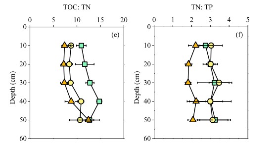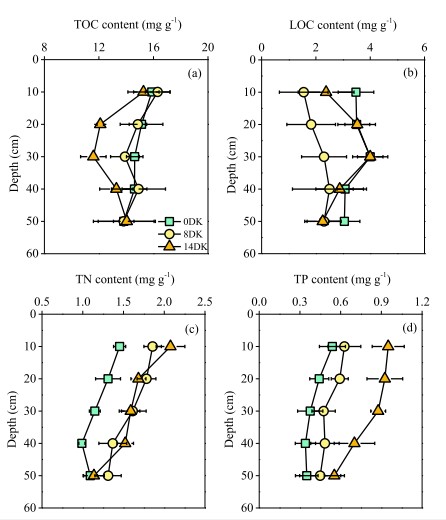 Hàm lượng TP được phân biệt rõ ràng giữa ba địa điểm có lịch sử xả khác nhau theo thứ tự sau: 14DK > 8DK > 0DK (p < 0,001). Hơn nữa, với mỗi độ sâu đất, 14DK có giá trị TP cao nhất. Xu hướng biến đổi trong hàm lượng TP của đất giữa các độ sâu đất khác nhau tương tự như đối với hàm lượng TN trong đất. Hàm lượng TP trong đất trung bình ở lớp 0–10 cm trên cùng lần lượt là 0,54, 0,63 và 0,95 mg/ g ở 0DK, 8DK và 14DK. Tương tự như nội dung TOC và TN, nội dung TP giảm đáng kể ở lớp 40–50 cm so với lớp 0–10 cm (Hình 3d, Bảng 1). Tuy nhiên, không có sự tương tác đáng kể nào được phát hiện giữa hai yếu tố lịch sử xả thải và độ sâu của đất đối với hàm lượng TP của đất.