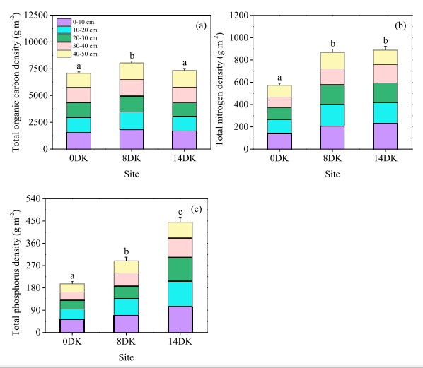 Mật độ TOC của đất dao động từ 7074,74 đến 8044,04 g/ m2 ở khoảng cách sâu 0–50 cm. Các giá trị ở 0DK và 14DK tương tự nhau và thấp hơn đáng kể so với giá trị ở mức 8DK (p < 0,05) (Hình 4a, Bảng 1). Mật độ TOC trung bình của đất là 1272,98–1804,71 g/ m2 cho mỗi lớp 10 cm. Mật độ TOC của đất ở lớp 0–10 cm cao hơn đáng kể so với bốn lớp còn lại (p < 0,001).