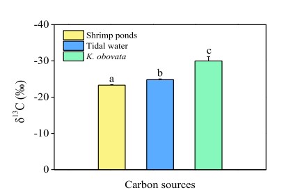 Hình 5. δ13C (‰) lơ lửng trong ao nuôi tôm, chất rắn lơ lửng từ nước thủy triều và lá K. obovata. Thanh lỗi đại diện cho độ lệch chuẩn. Các chữ cái khác nhau cho thấy sự khác biệt đáng kể ở p < 0,05.