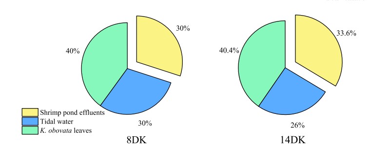 Trong nghiên cứu này, các giá trị δ13C (‰) trung bình thay đổi đáng kể giữa ba nguồn, và chúng lần lượt là −23,31‰, −24,80‰ và −29,98‰ trong ao nuôi tôm, SPOM từ nước thủy triều và thực vật K. obovata (Hình 5). Nói chung, lá K. obovata bị rụng nhiều nhất trong 13ºC, trong khi giá trị δ13C cao nhất được đo từ nước thải ao nuôi tôm. Các phân tích của IsoSource chỉ ra rằng tỷ lệ đóng góp vào TOC đất của nước thải ao tôm cao hơn hoặc tương tự so với sự đóng góp của nước thủy triều và thấp hơn một chút so với cây ngập mặn. Hơn nữa, tỷ lệ đóng góp của nước thải ở mức 14DK cao hơn 3,60% so với 8DK trong đất 0–10 cm trong rừng K. obovata (Hình 6). Kết quả cho thấy sự đóng góp TOC của nước thải ao tôm tăng lên cùng với lịch sử xả thải ngày càng tăng.