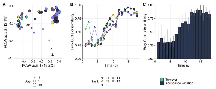 Hình 3. A. Sự phân bố PCoA của sự khác biệt Bray-Curtis của tất cả các hệ vi sinh vật nước nuôi trong quá trình nuôi. Các chấm được tô màu theo các bể khác nhau và kích thước tương ứng với số ngày sau khi bắt đầu canh tác.