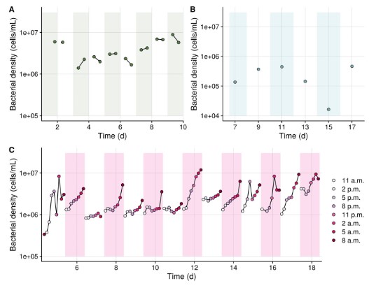 Đối với mỗi hệ vi sinh vật ngoại vi, mức độ biến thiên cao theo từng đợt được quan sát thấy. Những khác biệt theo lô này chủ yếu được cho là do sự khác biệt lớn về số lượng thành viên tương đối phong phú trong cùng một nhóm phân loại ‘cốt lõi’ (Bảng thông tin hỗ trợ S2-S5 và Hình S6). Ngoài ra, xét về mật độ vi khuẩn, người ta cũng quan sát thấy sự biến đổi cao giữa và trong các lô (Hình 4).