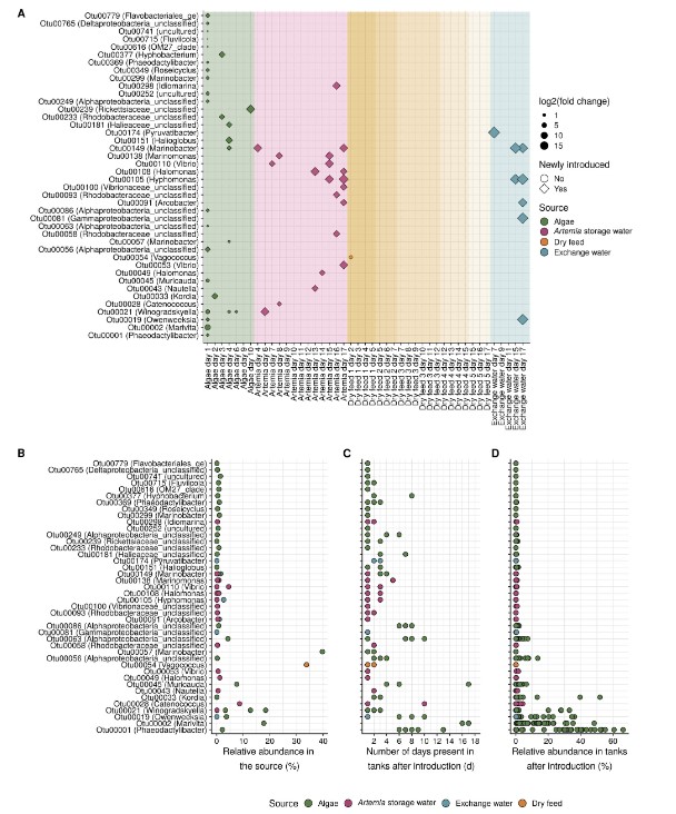 Phân tích theo dõi nguồn cho thấy rằng hệ vi sinh vật của tất cả các nguồn bên ngoài (tảo, Artemia, thức ăn khô và nước trao đổi) đã góp phần vào hệ vi sinh vật nước nuôi và rằng ± 10% OTUS nước nuôi (tức là 42 trên 498) đã được đưa vào thông qua các nguồn này (Hình 5A). Khi tính đến sự tăng trưởng của các đơn vị phân loại được đưa vào trong nước nuôi, chúng chiếm 37% quần thể nước nuôi trong toàn bộ quá trình canh tác. Điều này minh họa rằng một số đơn vị phân loại được giới thiệu đã có thể phát triển để trở thành thành viên cộng đồng dồi dào. Nói chung, khi so sánh lượng vi khuẩn mà các nguồn gây ra đối với nước nuôi và lượng vi khuẩn sản xuất trong bể nuôi, thì lượng vi khuẩn sản sinh ra là nguồn vi khuẩn chính (tức là mật độ vi khuẩn tăng từ 4,21 ± 1,44 x 105 tế bào/ mL lúc ban đầu lên tới 9,16 x 107 tế bào/ mL khi kết thúc quá trình nuôi cấy trong khi lượng vi khuẩn thông qua việc bổ sung các hệ vi sinh vật ngoại vi là 1,45 x 102 -1,22 x 104 tế bào/ mL/ ngày). Sự đóng góp của các nguồn khác nhau rất khác nhau về số lượng OTUS được đưa vào, thời gian cư trú và độ phong phú tương đối trong nước nuôi. Đóng góp lớn nhất của tảo, tiếp theo là Artemia, nước thay thế và thức ăn khô (Hình 5).