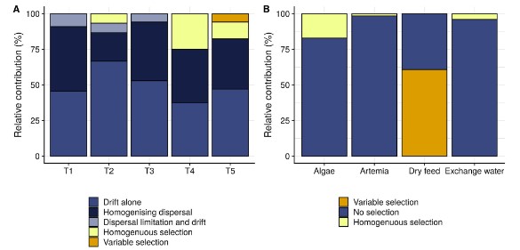 Phân tích đa dạng beta cho thấy các cộng đồng nước nuôi dần dần thay đổi trong quá trình nuôi (Hình 3A; Thông tin hỗ trợ Hình S3) và thông qua những thay đổi này, hệ vi sinh vật của các bể lặp lại ngày càng khác biệt với nhau (Hình 3B). Mặc dù các đơn vị phân loại hiện diện trong các bể tái tạo là tương tự nhau, nhưng mức độ phong phú tương đối mà chúng hiện diện rất khác nhau (Hình 3). Đánh giá của tập hợp cộng đồng cho thấy rằng động lực tạm thời trong các cộng đồng trong nước nuôi chủ yếu bị chi phối bởi các quá trình ngẫu nhiên (Hình 6A), điều này có thể giải thích sự không đồng nhất quan sát được này. Sự khác biệt giữa các lần lặp lại là hiện tượng thường xuyên được quan sát thấy trong quá trình nuôi các loài khác nhau, trong cả hệ thống theo đợt và hệ thống tuần hoàn (Chun và cộng sự, 2018; Almeida và cộng sự, 2019; Li và cộng sự, 2019; Dahle và cộng sự, 2020), cho thấy rằng sự tập hợp ngẫu nhiên có thể là một đặc điểm phổ biến của các hệ thống nuôi trồng thủy sản. Nguyên nhân có thể dẫn đến tính ngẫu nhiên này có thể là do cơ chế xáo trộn thông qua thay nước, bổ sung thức ăn, v.v. (Santillan và cộng sự, 2018) hoặc hiện tượng phú dưỡng của nước (Yang và cộng sự, 2018). Trong cả hai trường hợp, việc tập hợp sẽ phụ thuộc vào loại hệ thống nuôi được sử dụng, vì điều này quyết định các đặc tính vận hành như thay/tuần hoàn nước, tần suất cho ăn, v.v. Cần nghiên cứu sâu hơn để kiểm tra tính khái quát của quan sát của chúng tôi.
