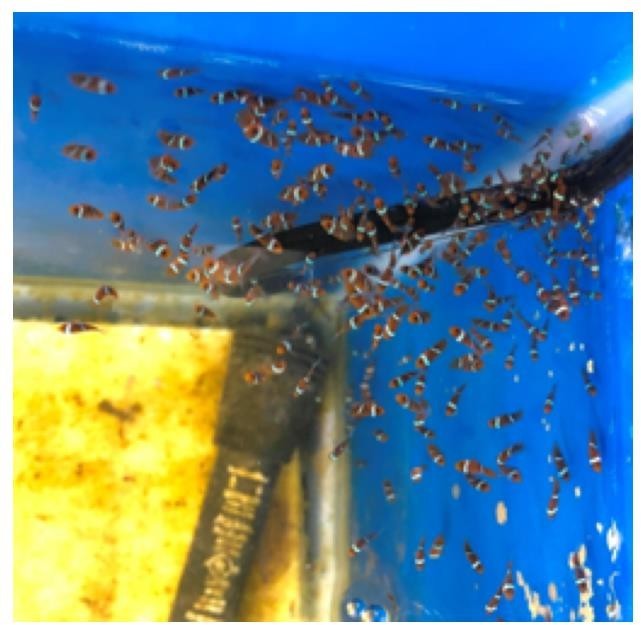 Đây là hình ảnh một đàn cá hề ở ở giai đoạn 14 ngày sau thụ tinh (PH), được cho ăn luân trùng ăn Tetraselmis.