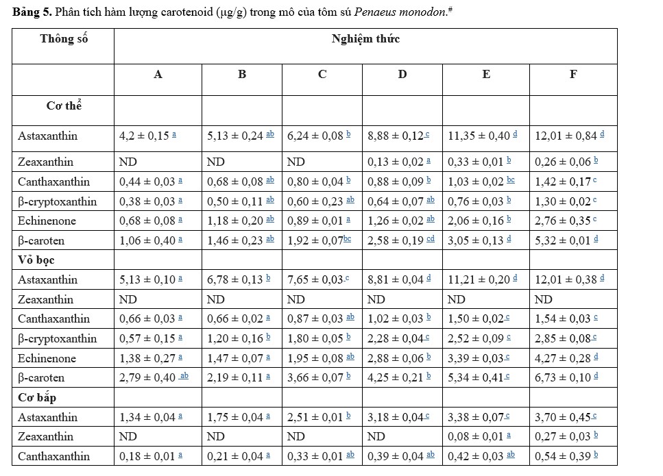 Kết quả thành phần toàn bộ cơ thể phù hợp với những phát hiện của Niu và cộng sự (2009) và Zhang và cộng sự (2013) trong đó việc bổ sung caroten dường như không ảnh hưởng đến thành phần toàn bộ cơ thể tôm.