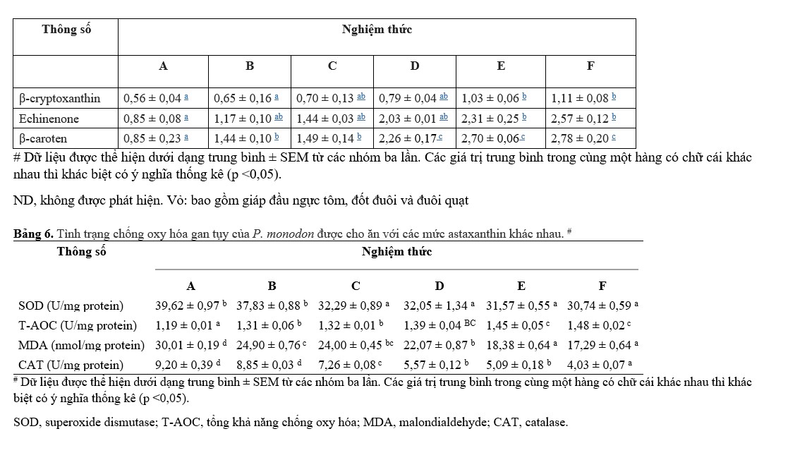 Các kết quả thu được từ việc xác định các hoạt động chống oxy hóa trong gan tụy của tôm được thể hiện trong Bảng 6. T-AOC tăng đáng kể ở nghiệm thức bổ sung Ast so với đối chứng, trong khi SOD, CAT và MDA giảm đáng kể (p<0,05).