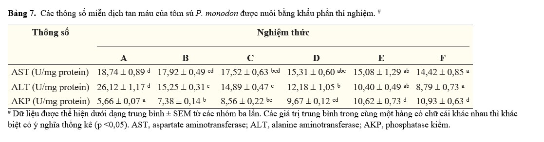 Kết quả miễn dịch hemolymp của P. monodon được trình bày trong Bảng 7. AKP tăng đáng kể (p<0,05) trong các nghiệm thức bổ sung Ast, trong khi không có ý nghĩa nào khác (p>0,05) được phát hiện trong các nghiệm thức bằng D–F. AST cho thấy xu hướng giảm liên tục với sự gia tăng mức độ Ast trong khẩu phần ăn. Mức bổ sung Ast trong khẩu phần ăn 61,5 mg/kg (nghiệm thức D) cho thấy giá trị cao hơn đáng kể so với đối chứng. Ngược lại, Ast trong khẩu phần ăn giảm đáng kể (p <0,05) làm giảm hoạt tính ALT trong hemolymp của tôm.