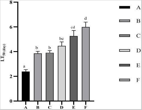 Các giá trị LT50 đối với thử nghiệm khả năng chống chịu căng thẳng do nhiễm Vibrio parahaemolyticus được thể hiện trong Hình 2. Các giá trị LT50 tăng đáng kể (p<0,05) khi bổ sung Ast trong khẩu phần ăn. Hiệu suất tốt nhất được đưa ra bởi nghiệm thức F, trong khi không quan sát thấy sự khác biệt đáng kể (p>0,05) so với nghiệm thức E.