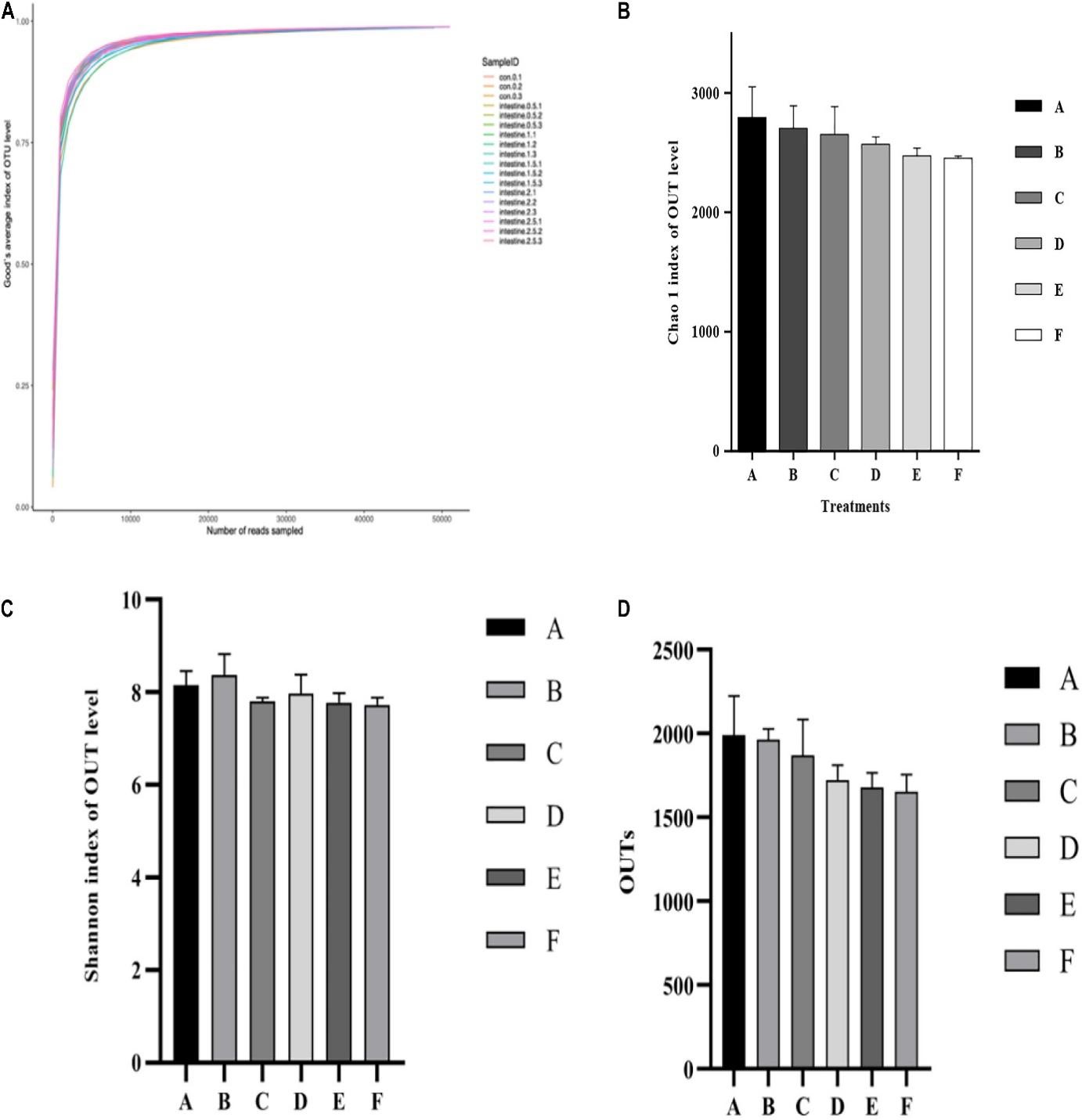 Hình 3. Phân tích so sánh đa dạng alpha với cộng đồng vi sinh vật trong ruột tôm được cho ăn với các mức astaxanthin khác nhau trong 56 ngày. (A) Đường cong Good’s coverage; (B) Chỉ số phong phú Chao 1; (C) Chỉ số đa dạng của Shannon; (D) Chỉ số so sánh độ phong phú của OTU đối với các mẫu đường ruột A, B, C, D, E và F. Dữ liệu được biểu thị dưới dạng trung bình ± SEM từ các nhóm ba lần. Các chữ cái khác nhau cho thấy sự khác biệt đáng kể (p <0,05) giữa các thanh khác nhau. OTU, đơn vị phân loại hoạt động.