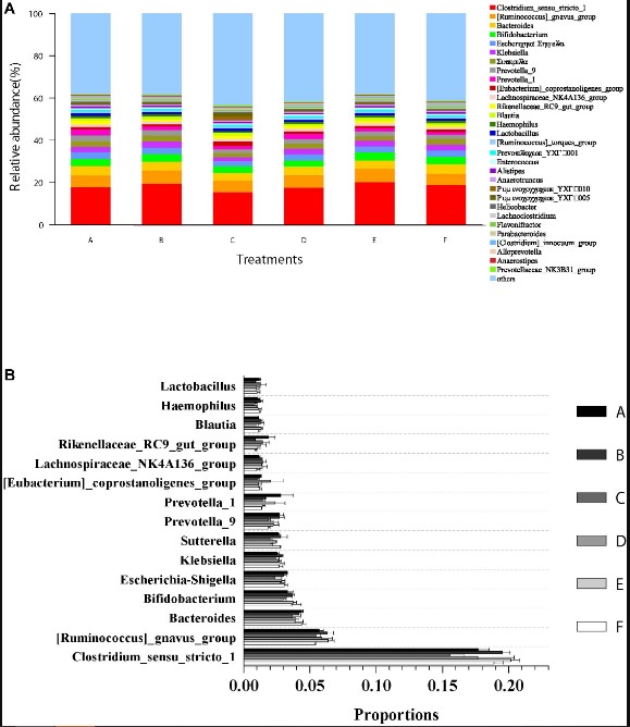 Thành phần cộng đồng vi sinh vật và sự phong phú của tất cả các mẫu đường ruột ở cấp độ chi được trình bày trong Hình 5. 15 chi hàng đầu trong trình tự có thể phân loại là Clostridium, Ruminococcus, Bacteroides, Bifidobacterium, Escherichia–Shigella, Klebsiella, Sutterella, Prevotella, Prevotella, Eubacterium, Lachnospiraceae, Rikenellaceae, Blautia, Haemophilus Lactobacillus (Hình 5A). Kết quả phân tích thử nghiệm ANOVA không cho thấy bất kỳ sự khác biệt đáng kể nào (p>0,05) về mức độ tải lượng tương đối của các giống này (Hình 5B) giữa tất cả các nghiệm thức.